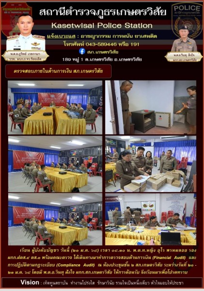 เมื่อวันที่ 21-23 มกราคม 2568 พ.ต.อ.วินทุ ฝังใจ ผกก.สภ.เกษตรวิสัย พร้อมด้วยข้าราชการที่เกี่ยวข้องกับงานการเงินและพัสดุ รับการตรวจราชการจากกองตรวจสอบภายใน 1 สำนักงานตรวจสอบภายใน สำนักงานตำรวจแห่งชาติ
