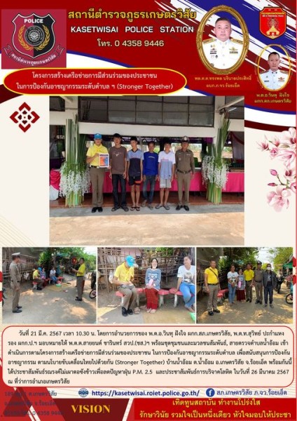 วันที่ 21 มี.ค. 2567 เวลา 10.30 น. โดยการอำนวยการของ พ.ต.อ.วินทุ ฝังใจ ผกก.สภ.เกษตรวิสัย, พ.ต....