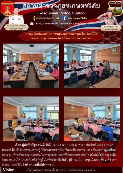 วันนี้ (22 เม.ย.68) 10.00 น. พ.ต.อ.ประวิทย์ โทหา ผกก.สภ.เกษตรวิสัย เข้าร่วมประชุมการปฏิบัติตาม...